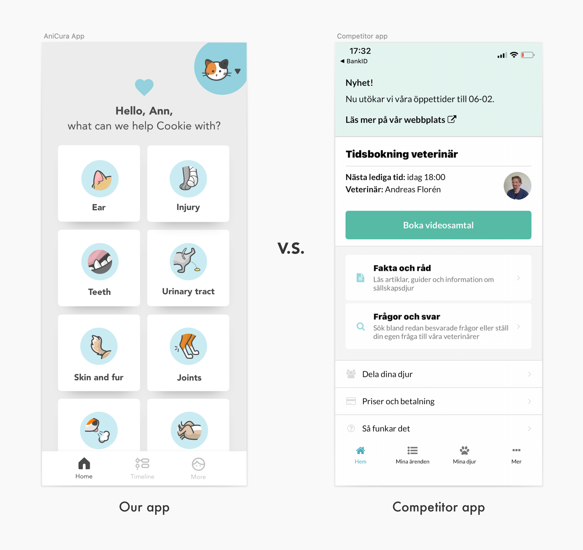 The core UX foundation was already established through Doktor.se (the detailed UX reasoning is here), so while I adapted flows for the veterinary context, the real design opportunity here was not structure — it was emotion and identity.