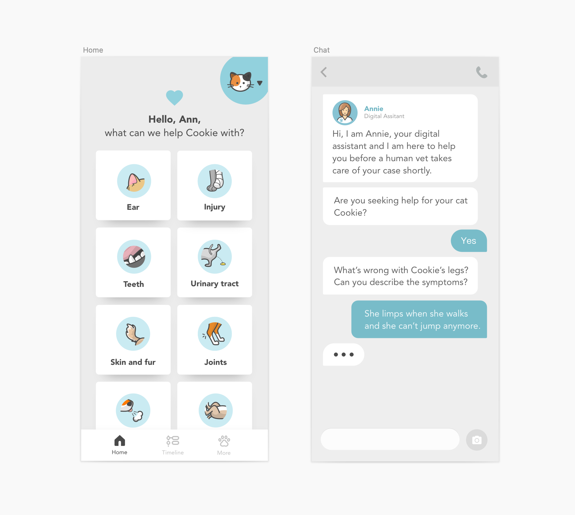 I also intentionally designed them to look slightly unwell. Not distressing, but just enough to signal vulnerability. The goal was to gently trigger care, so the users want to help their pets by talking to a vet.